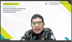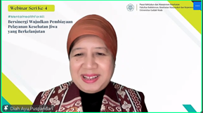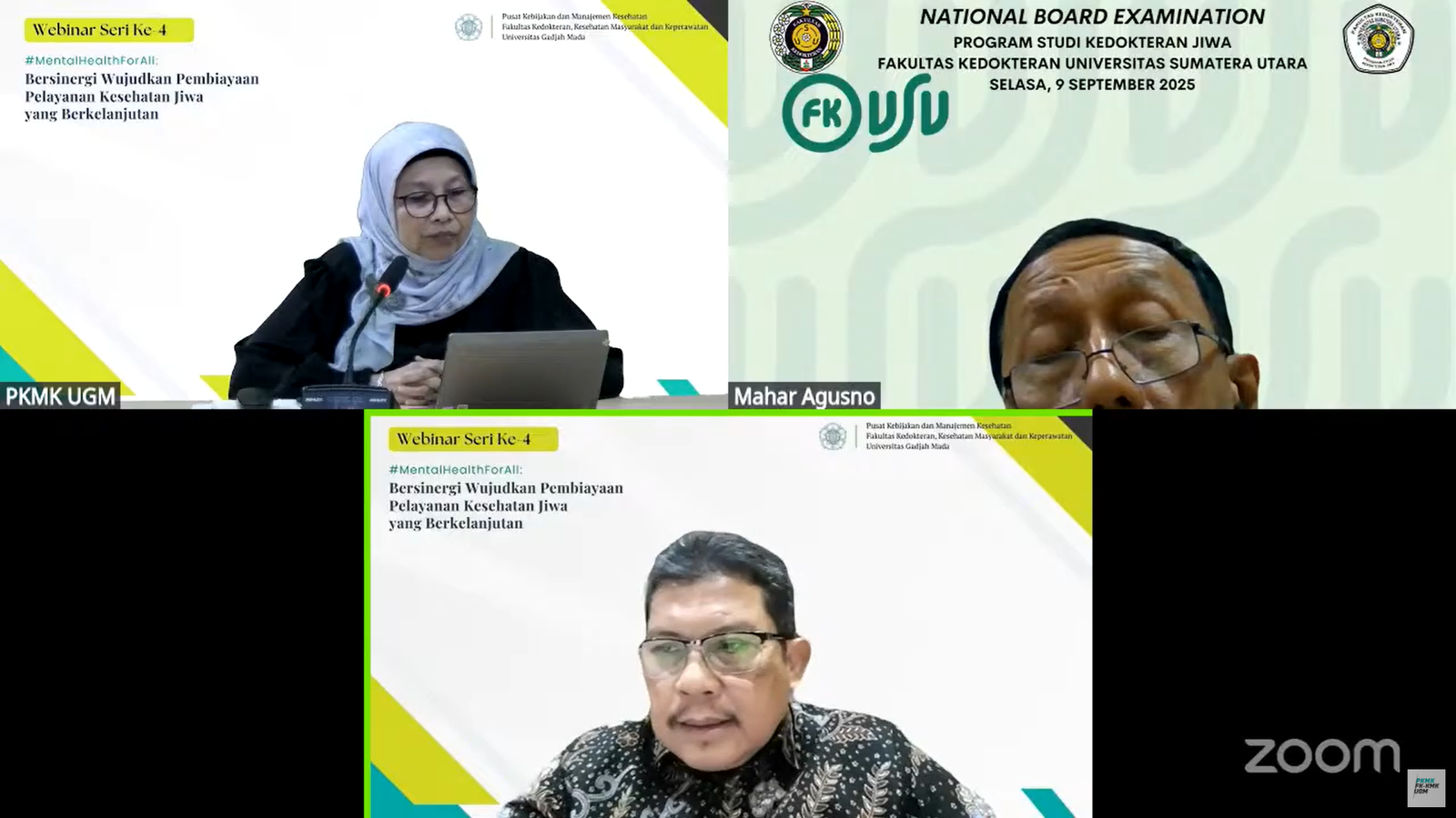 PKMK-Yogyakarta. Pusat Kebijakan dan Manajemen Kesehatan (PKMK) Fakultas Kedokteran, Kesehatan Masyarakat, dan Keperawatan Universitas Gadjah Mada (FK-KMK UGM) menyelenggarakan Webinar Kesehatan Jiwa Seri keempat dengan tema #MentalHealthForAll: Bersinergi Wujudkan Pembiayaan Pelayanan Kesehatan Jiwa yang Berkelanjutan pada 19 September 2025. Kegiatan ini bertujuan untuk meningkatkan pemahaman serta kesadaran pemangku kepentingan terhadap isu strategis terkait pembiayaan pelayanan kesehatan jiwa yang inklusif dan berkelanjutan. Webinar ini dipandu oleh dr. Arida Oetami, M.Kes, menghadirkan narasumber Prof. dr. Laksono Trisnantoro, M.Sc., PhD (Guru Besar FK-KMK UGM), Prof. dr. Ali Ghufron Mukti, MSc, PhD (Direktur Utama BPJS Kesehatan), dan Dr. Diah Ayu Puspandari, Apt, M.Kes., MBA., AAK (Ketua Pusat Kebijakan dan Manajemen Asuransi Kesehatan FK-KMK UGM)